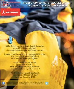 ATOMIC WINTER 14/15 PRODUCT LAUNCH THURSDAY 16TH OCTOBER, 5-9PM Ski Bartlett are hosting a party to launch the Atomic winter 2014/15 ski equipment. …including Atomics exciting NEW clothing range! To get you into the winter mood theyve got FREE Alpine drinks and nibbles served up (5-9pm) with the help of some special guests! Lots of Atomic and Ski Bartlett goodies to be won… FREE prize draw entry for all attendees + an extra entry for every £25 you spend! 10% off all Atomic products purchased… + Free Atomic duffle bag with every Atomic purchase over £100! Look forward to seeing you there…